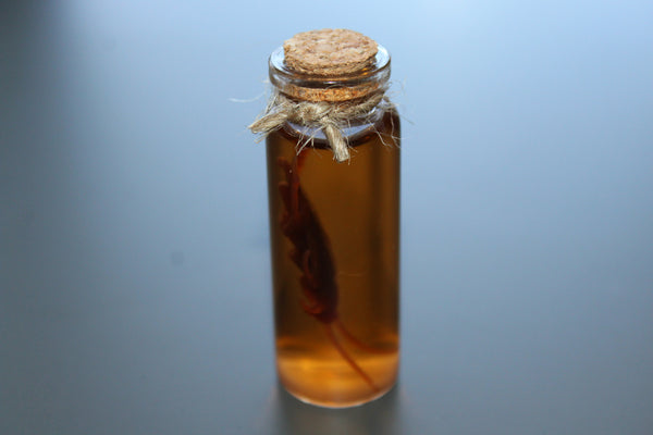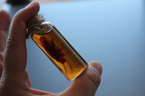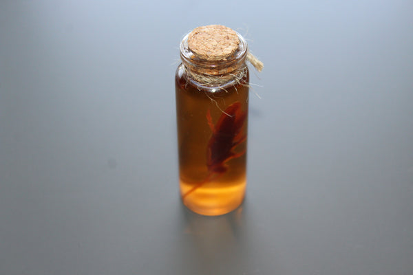 The specimen jar includes 5 fake cockroaches in yellow preservation liquid. The size of the jar is approximately 10cm high x 5cm wide.