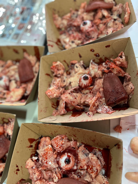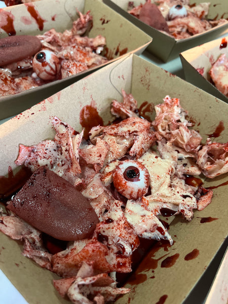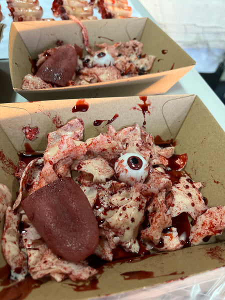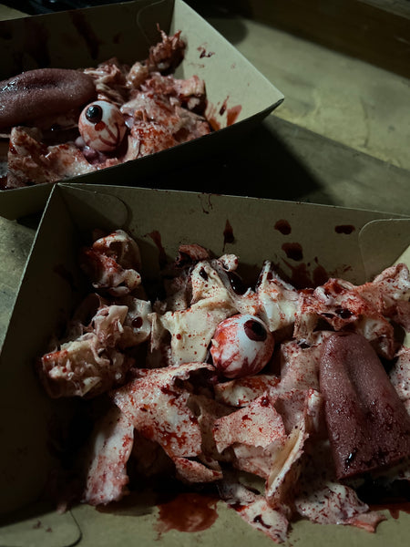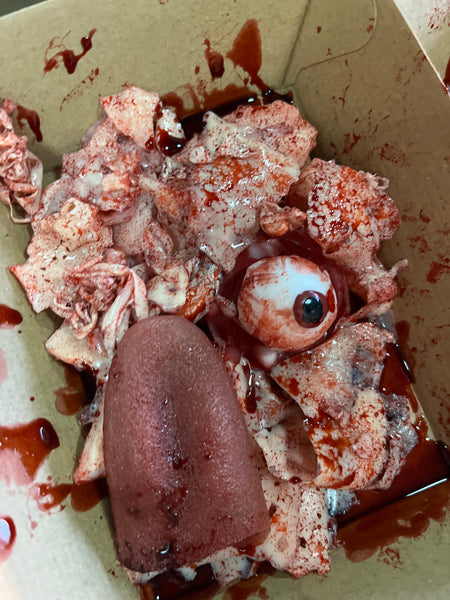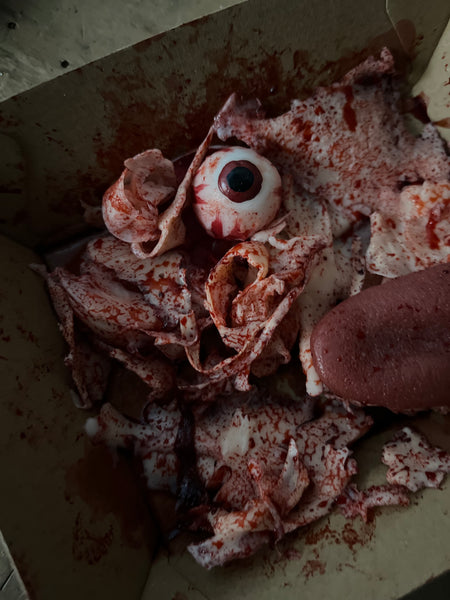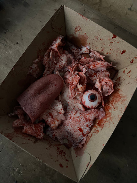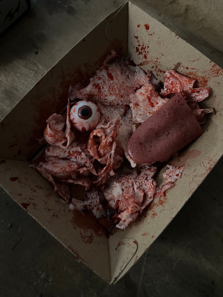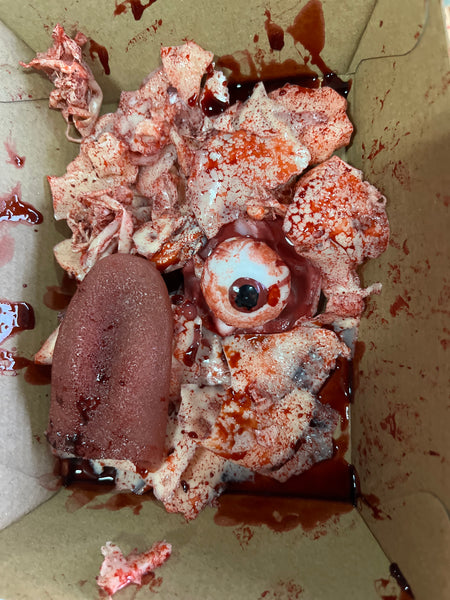 All individual items are reusable, and suit many other Halloween, Zombie, Film & TV, and Special Effects Makeup looks! The props will not be stuck onto the brown cardboard container. You can assemble this platter how you would like it!