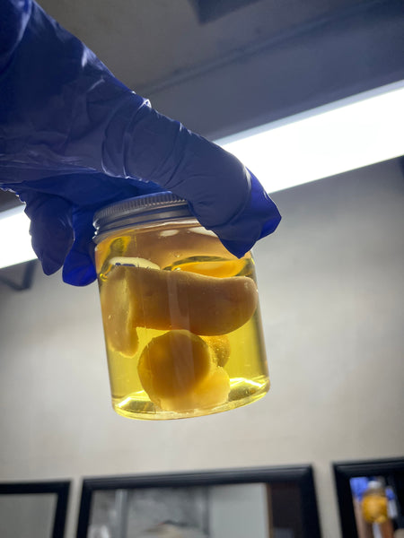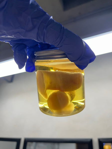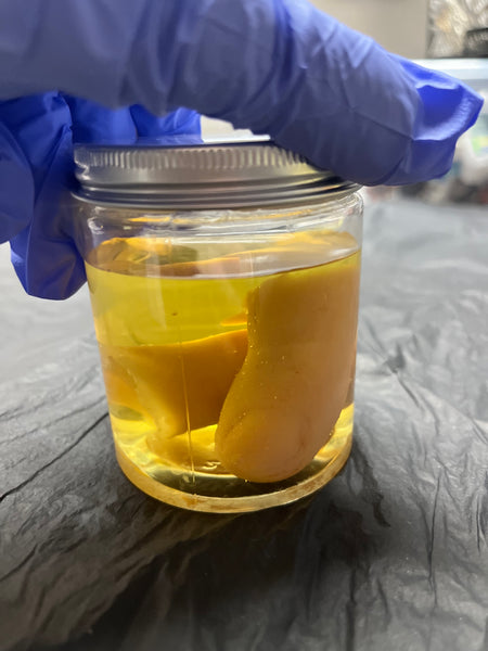 The jar has fake yellow liquid to symbolise preservation liquid, and 2 beige toes.