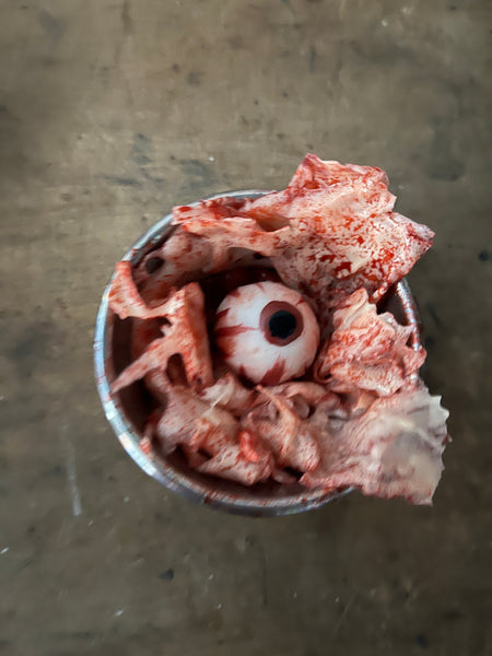 Fake Eyeball and Body Flesh in Medical Metal Cup Display Prop.