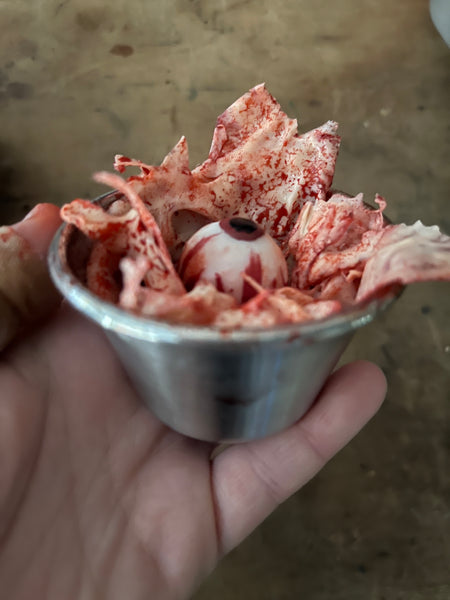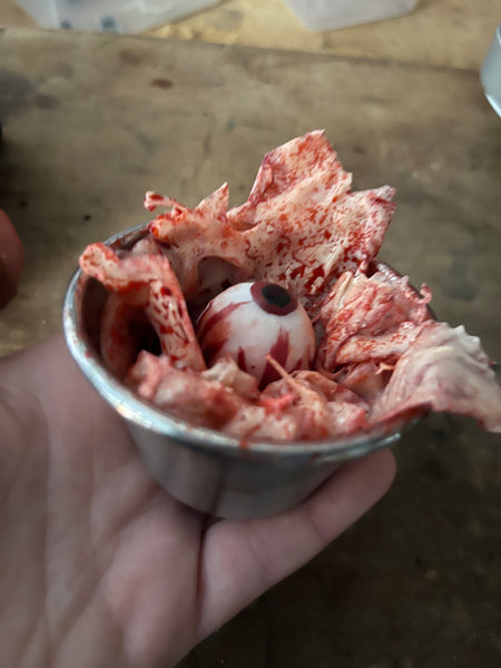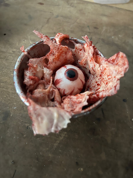 These specimen prop in a medical metal cup by ForensicFX Studios is designed to be used for Film & TV, Halloween, Zombie and Special Effects Makeup (SFX), as well as Forensic and Medical Training. It can also be used as a display piece in a glass cabinet or collective piece.